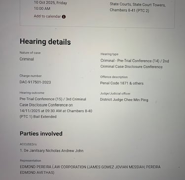 So yet again Nicholas Andrew John de Janitsary and his cases are back in court, now the much postponed pre trial conference number 11 is scheduled for the 18th of June at the Supreme Court.It appears Janitsary has run out of delaying his trial, but not out of complaints that he is being defamed by us.The problem is that he cannot tell the truth ever , and even his high priced (unpaid) lawyers both in Singapore and London stopped representing him, yet mysteriously a web provider recently received a legal letter on the fantasist and fraudster's behalf, from his London law firm, who have had nothing to do with him since November 2023 , an interesting coincidence is that Janitsary is charged with forging a legal letter from the same firm following his arrest.So currently on bail, hanging around the Shangri La hotel during a ministerial security conference , pretending he was a delegate.Gets stopped by a security detail as he is suspicious! LMFAO. Gets expelled from said hotel and told not to return tried to lie his way out of it with his usual BS , forgot to tell them he was currently on bail , yet seems to think that his actions have no consequences as usual for him , if you commit further criminal offences whilst on bail, your bail is revoked.The PTC on the 18th may be a lot more interesting than normal.