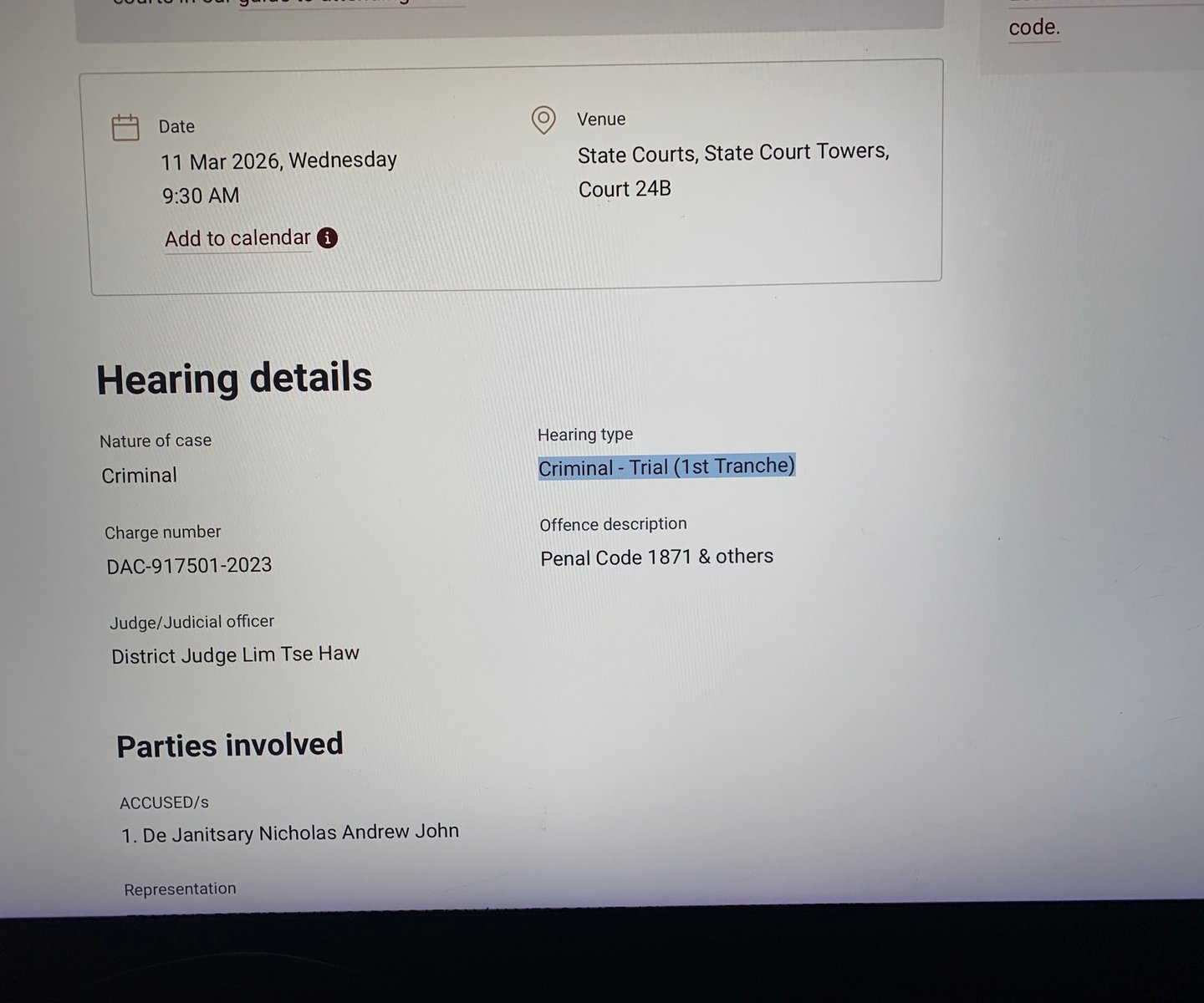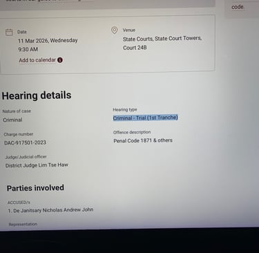 TRIAL BEGINS 11th of March,Court 24b, State Court Towers. at 09.30 a.m Singapore.